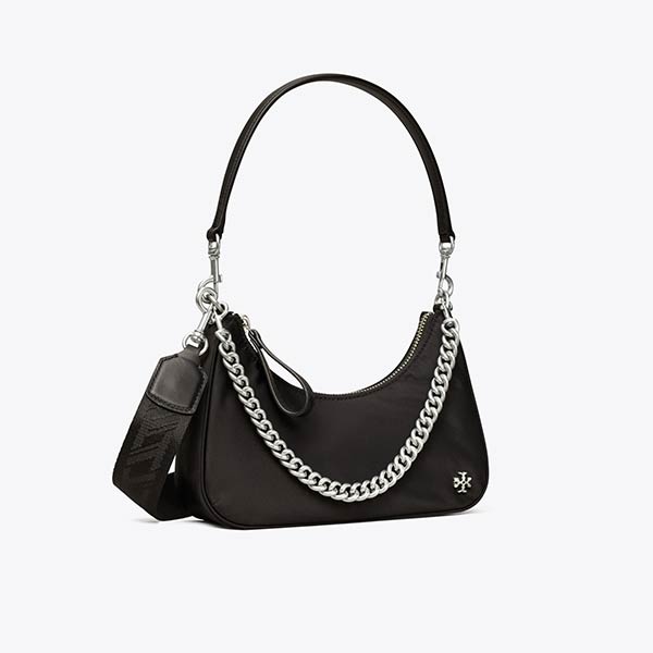 151 Mercer 小號新月包,命名來自品牌位於紐約歷史悠久的 SoHo 區旗艦店,展現曼哈頓下城的活力精神。本款TB包廓形體現 90 年代的簡約風格,可輕鬆夾在腋下。精選環保錦綸打造,具有三種背法:用肩背帶、鏈條背帶或網紋斜背帶肩背。