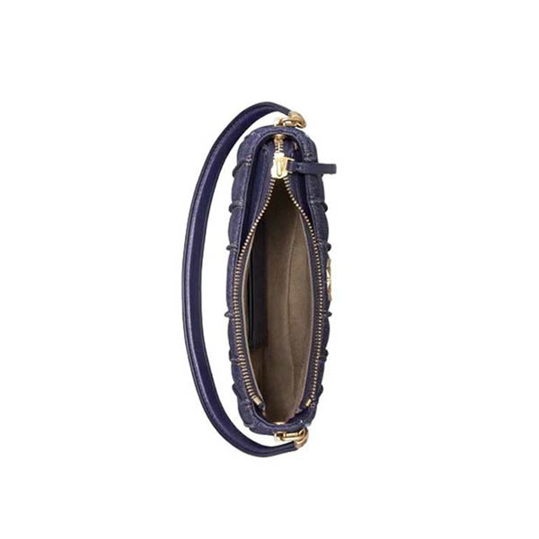 Kira 迷你手袋,包身由丹寧牛仔布材質打造結合線形絎縫,呼應古董車的精緻內飾。包款時髦迷人,內外均設有口袋,具有兩種背法:用皮革肩背帶或可拆卸鏈條背帶肩背。