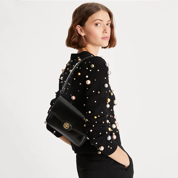 新款Tory Burch包款系列以設計師 Tory的父母 Buddy 和 Reva Robinson 的名字命名,體現他們對旅行的熱愛。經典百搭的款型,適於日常使用。本款 Robinson 兩用肩背包,選用精美的spazzolato 皮革打造,飾以光滑的圓潤包邊。