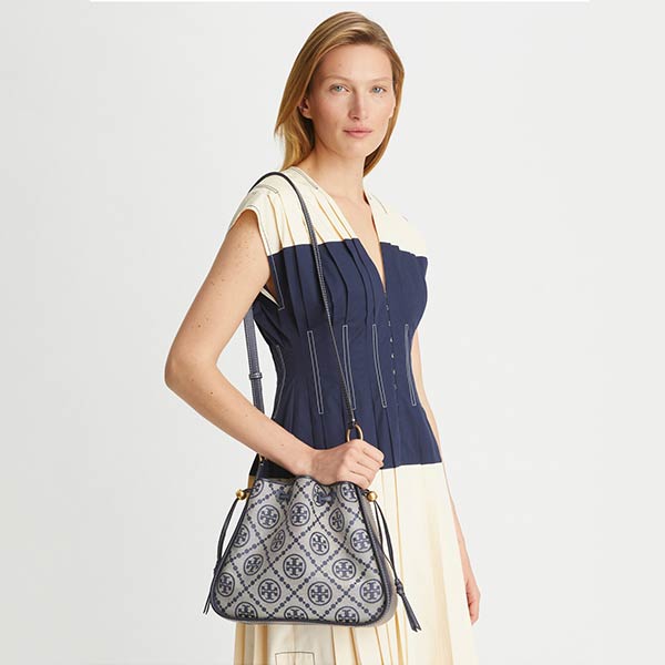 全新 T Monogram 圖案,靈感源自傳統賓夕法尼亞州絎縫的經典圖案,禮讚品牌標誌性雙 T Logo。Tory Burch 推出全新抽繩肩背包,由編織提花面料製成,造型別緻有型。柔軟垂墜的版型設計,皮革飾邊更添立體感。打結抽繩開合點綴有珠飾推扣,可將包口收緊。採用柔軟的人造絨面革內襯,1個內部口袋可有序放置隨身物件。每一個設計細節,凸顯實用功能性。